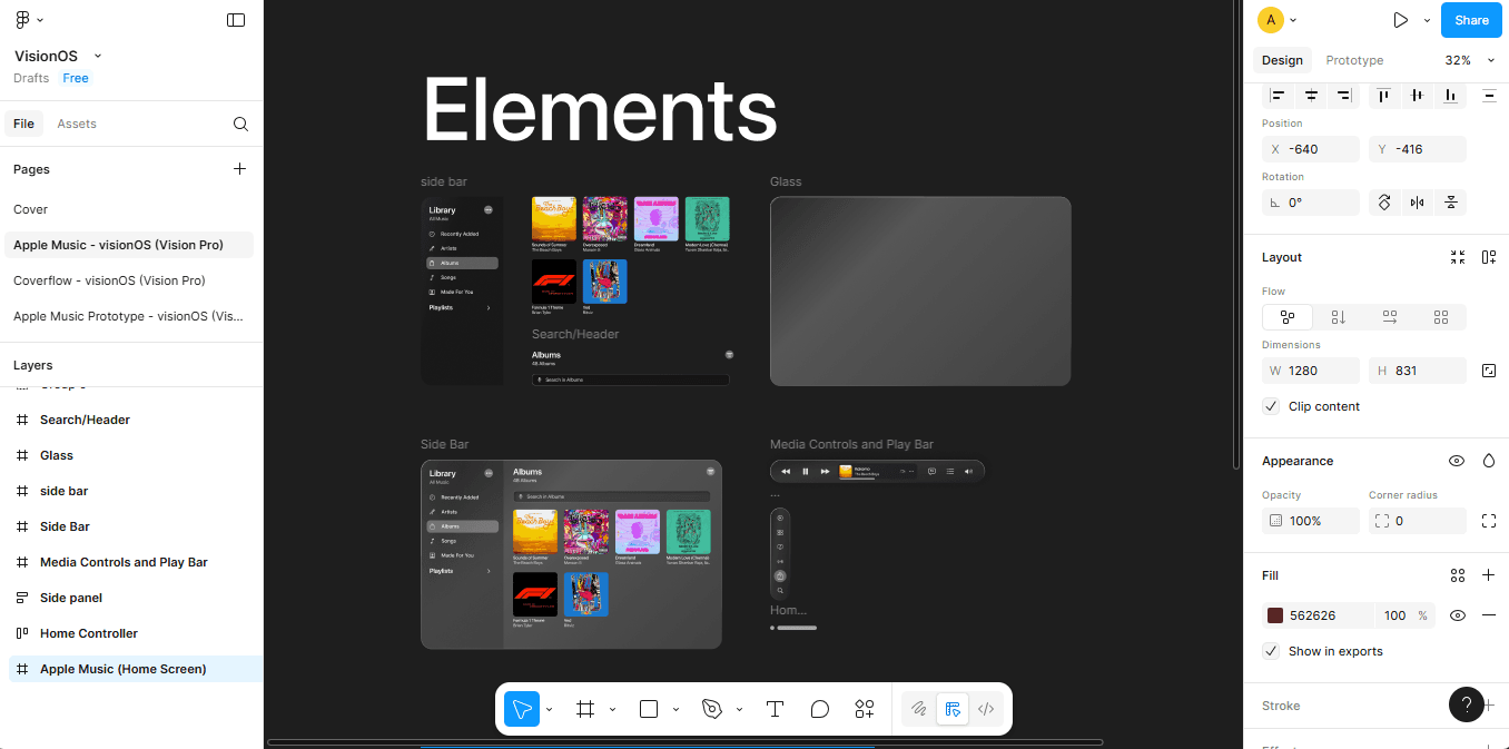 Component consistency in Figma: Setting up reusable elements (sidebar, glass panels, play bar).