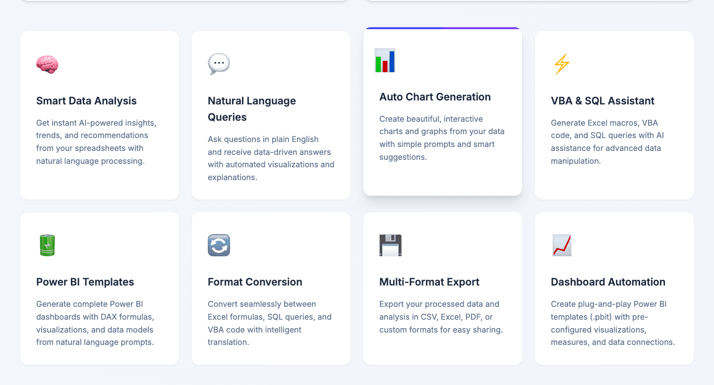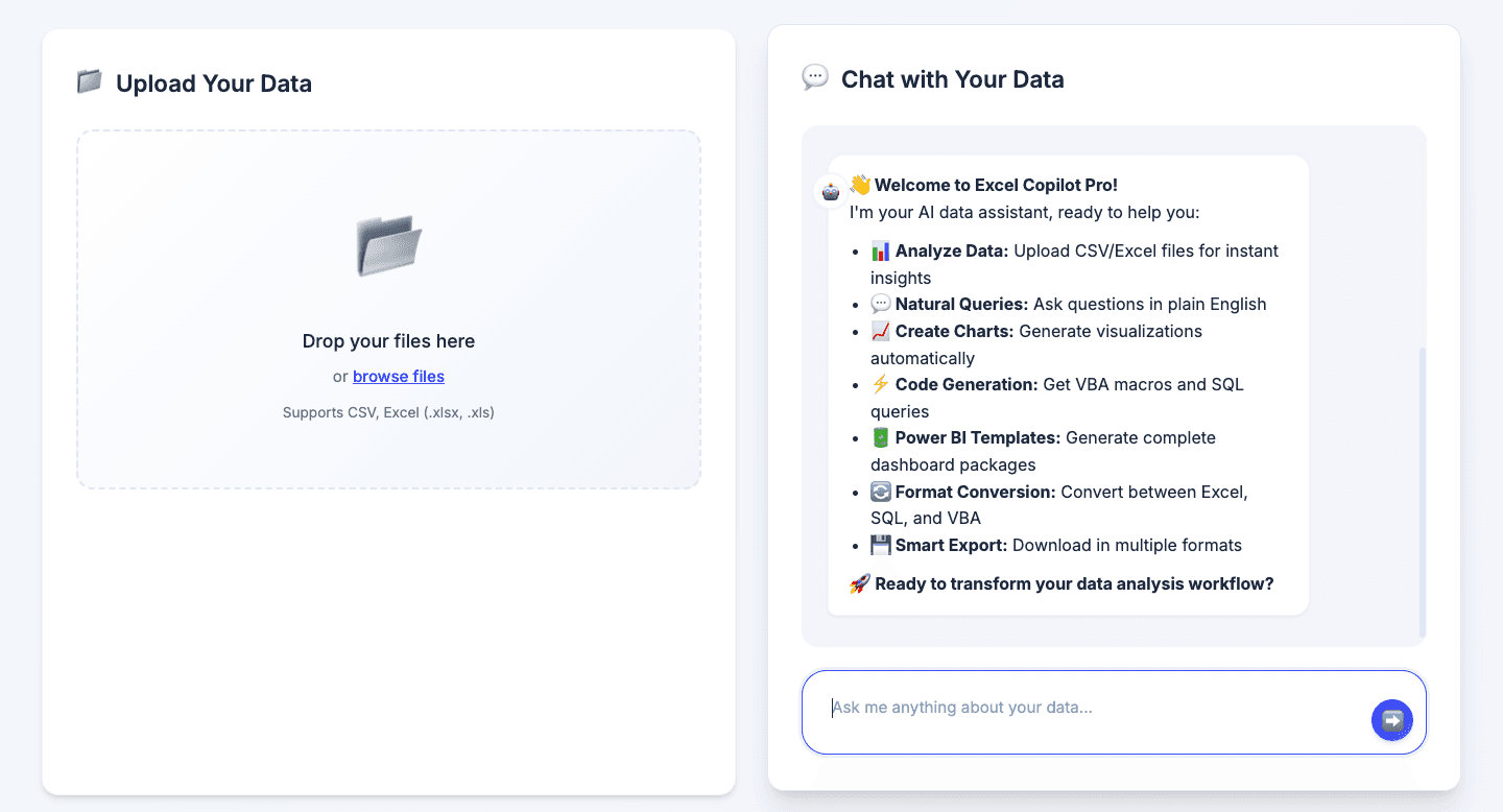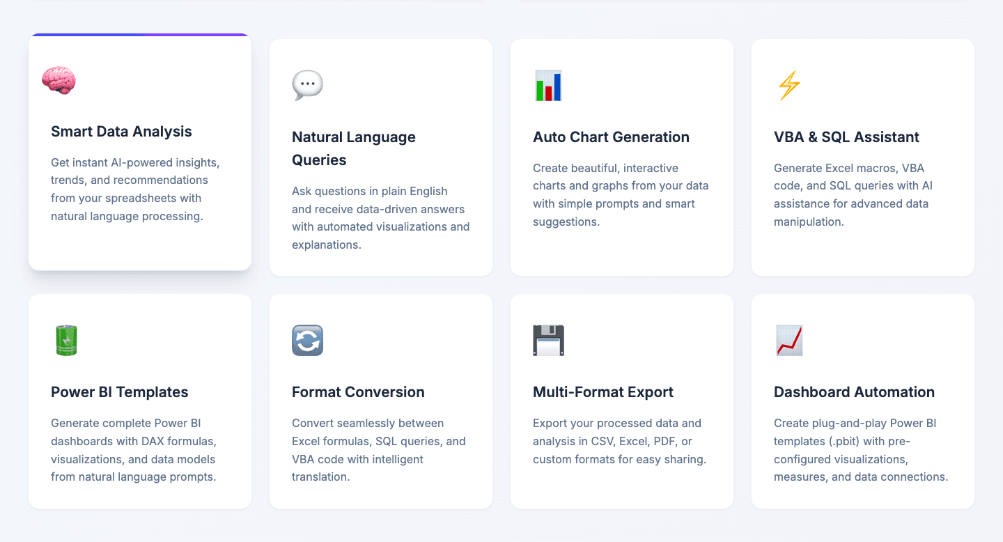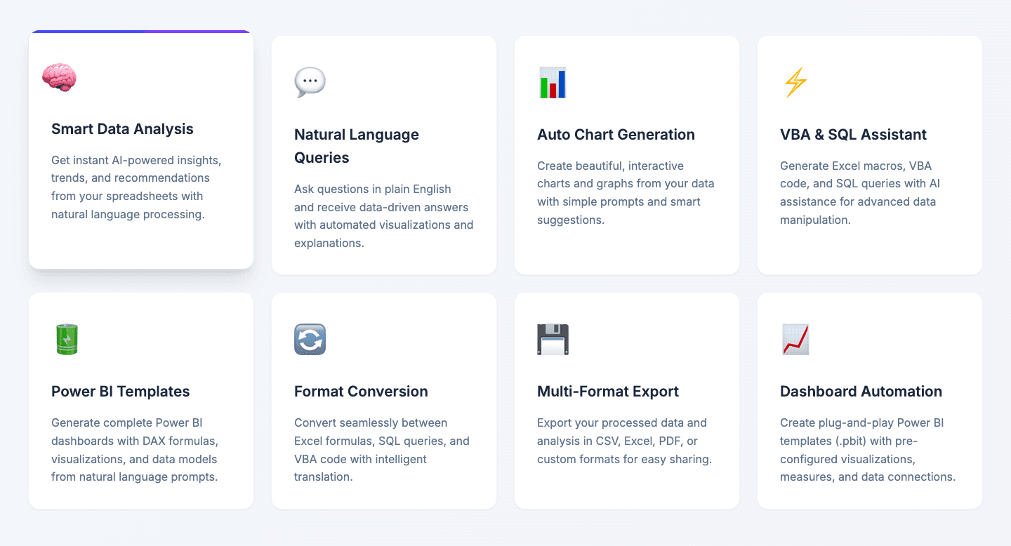 Natural Language Prompts Predefined templates for the most common tasks — Data Summary, SQL Query, Excel Formula, VBA Macro — alongside a free-form input for anything custom. The AI reads your column headers and sample data before responding.