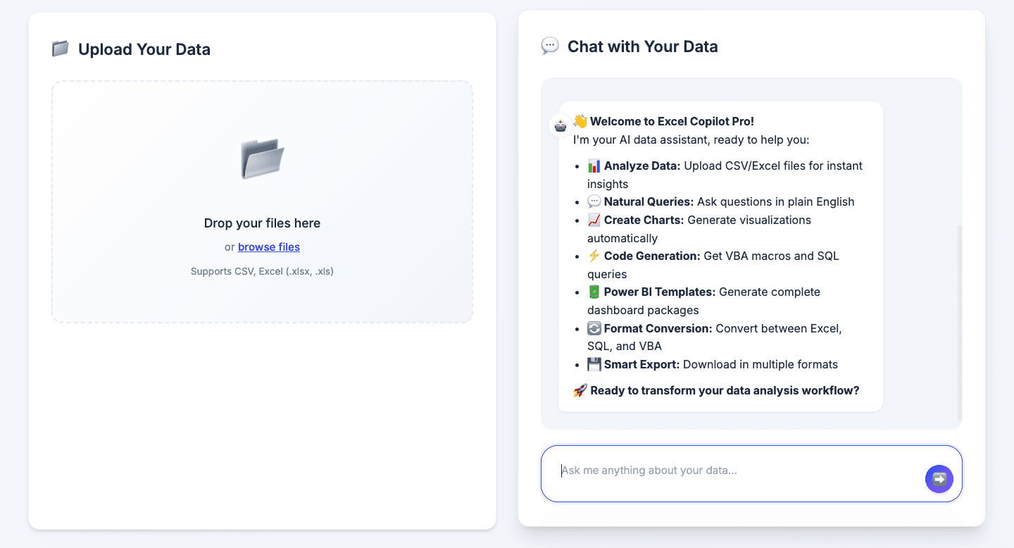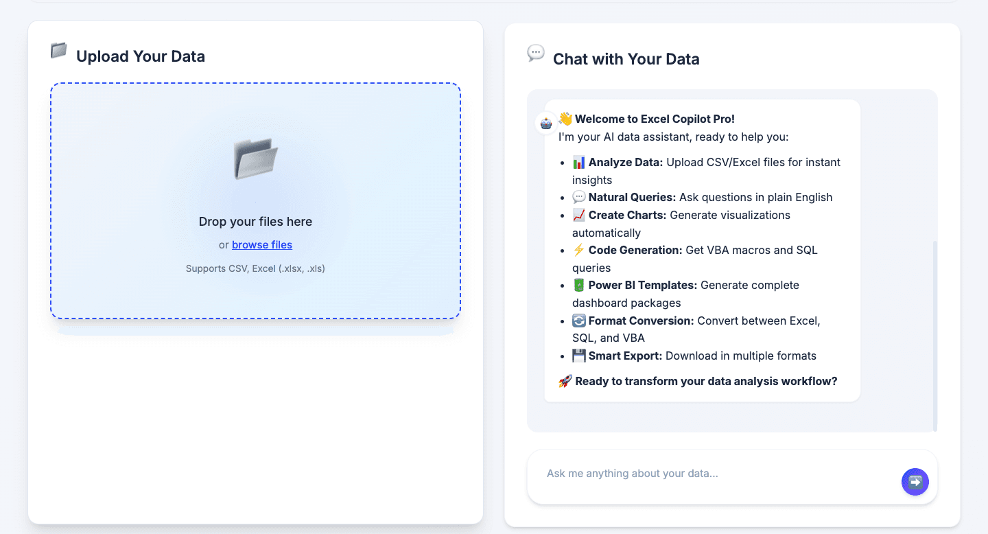 A single, zero-install web app where you upload a spreadsheet, describe what you want in plain English, and get back: