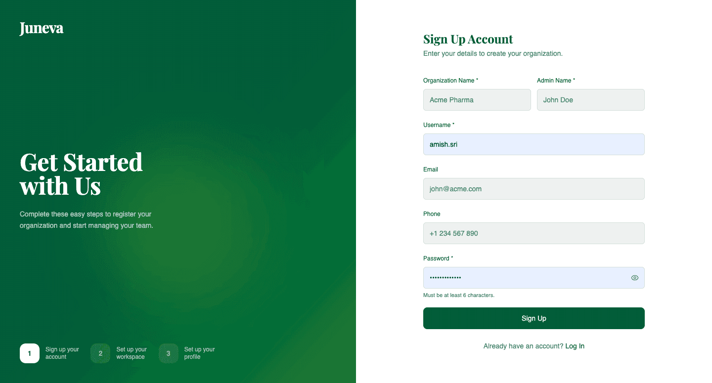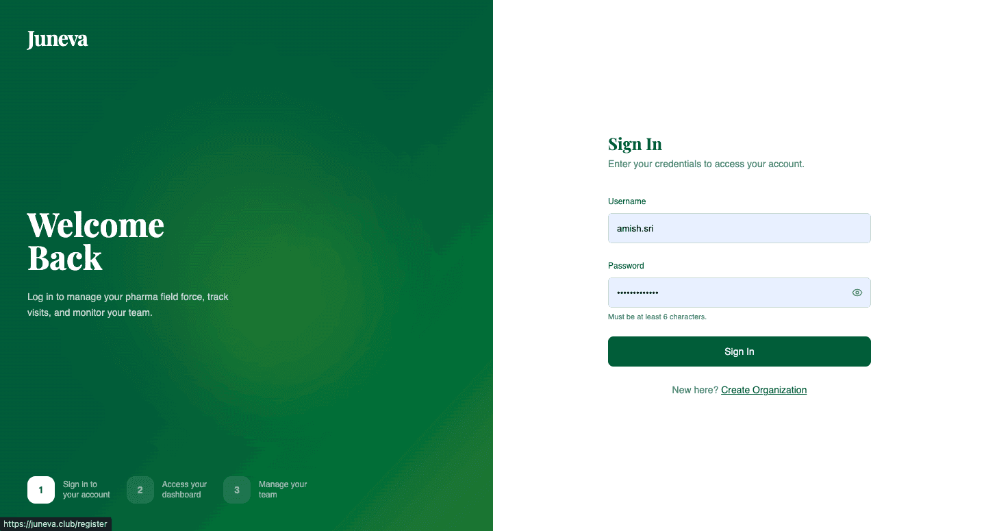 1. Multi-Organisation Workspace Juneva supports multiple pharma organisations operating independently within a secure, structured environment. Each organisation has admin-level controls, role-based access, representative onboarding, and a structured user hierarchy — making the system scalable from 5 reps to 500+.