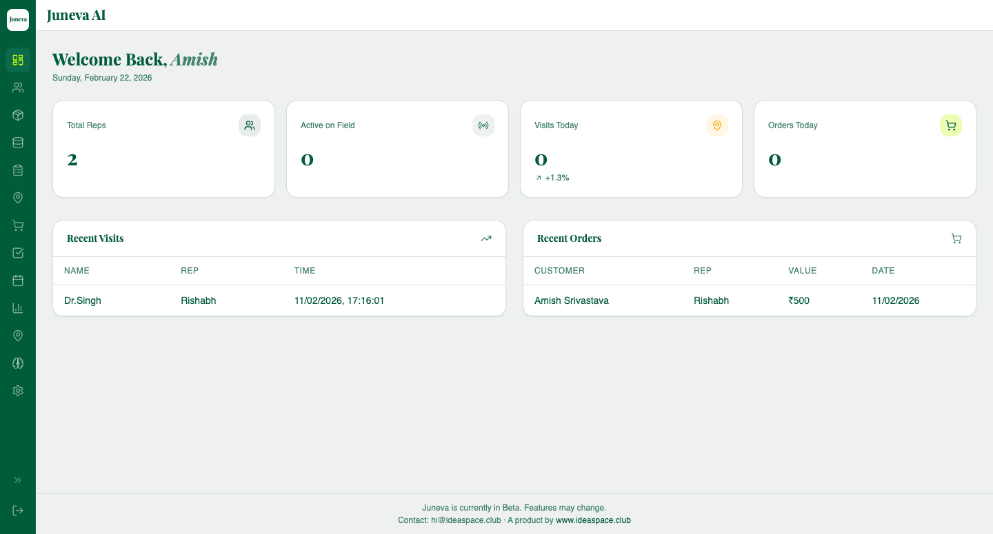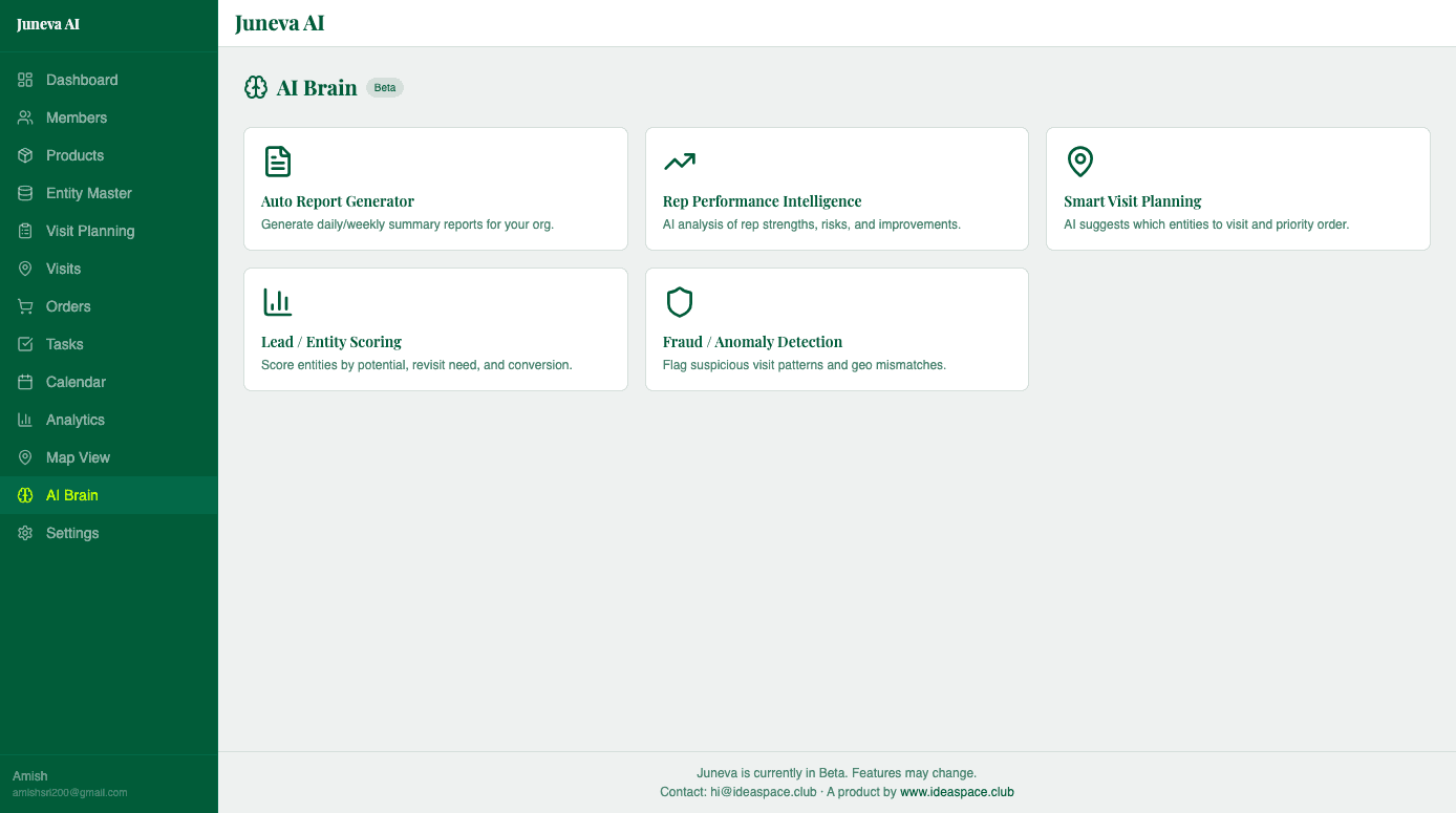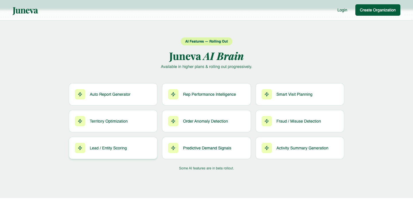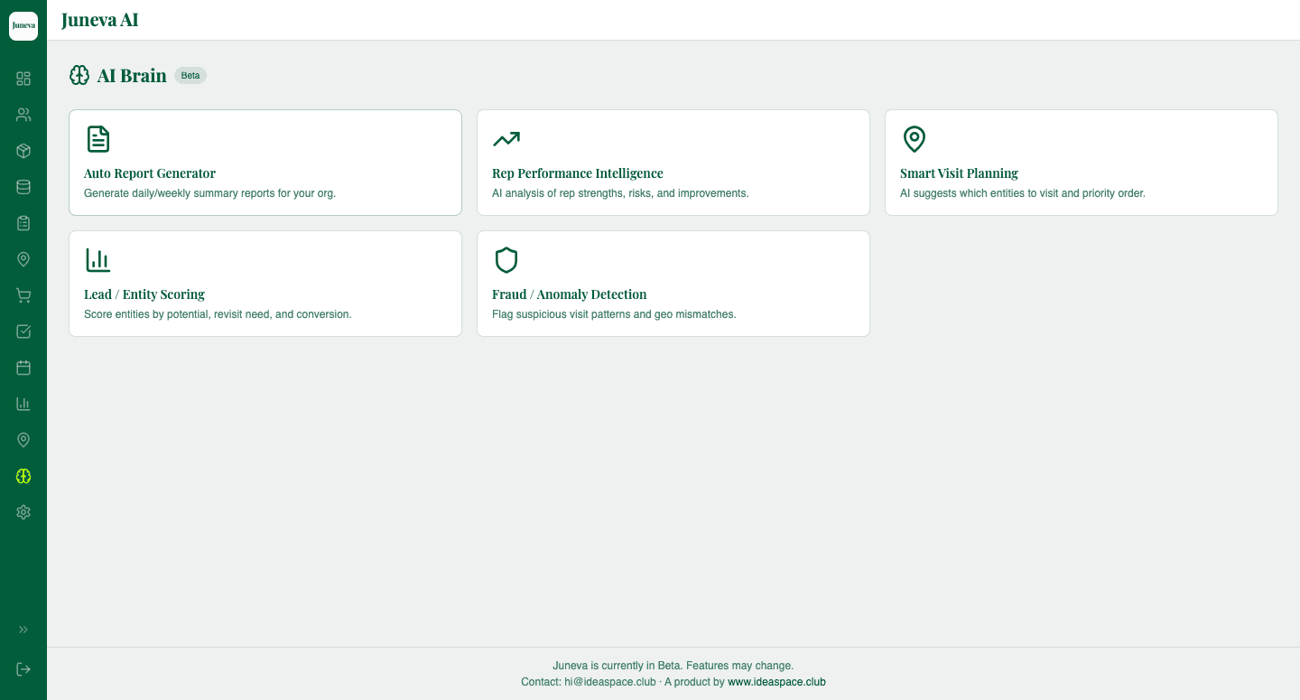 7. AI Intelligence Layer (Rolling Out) Juneva is evolving from a tracking tool into a field intelligence platform. The AI layer focuses on smart visit planning, performance pattern detection, rep productivity insights, auto-generated summaries, and anomaly detection — transforming raw field data into managerial intelligence.