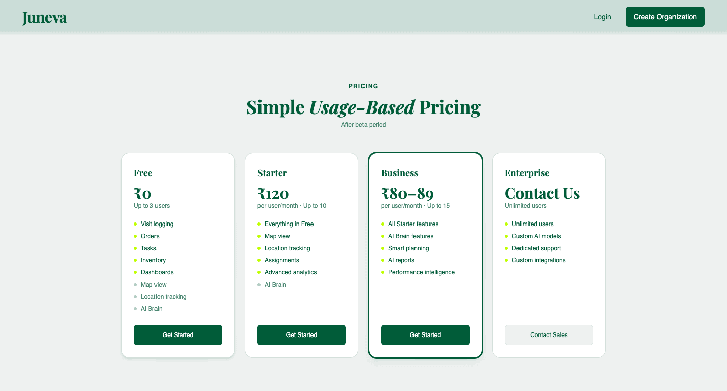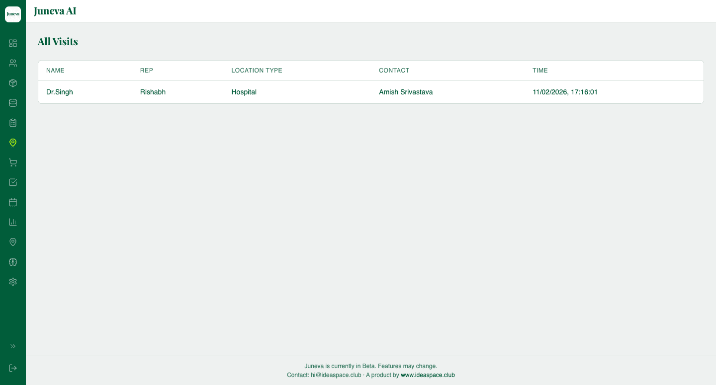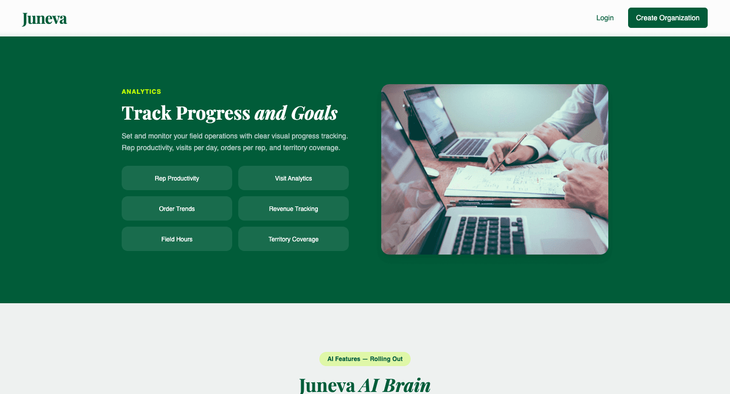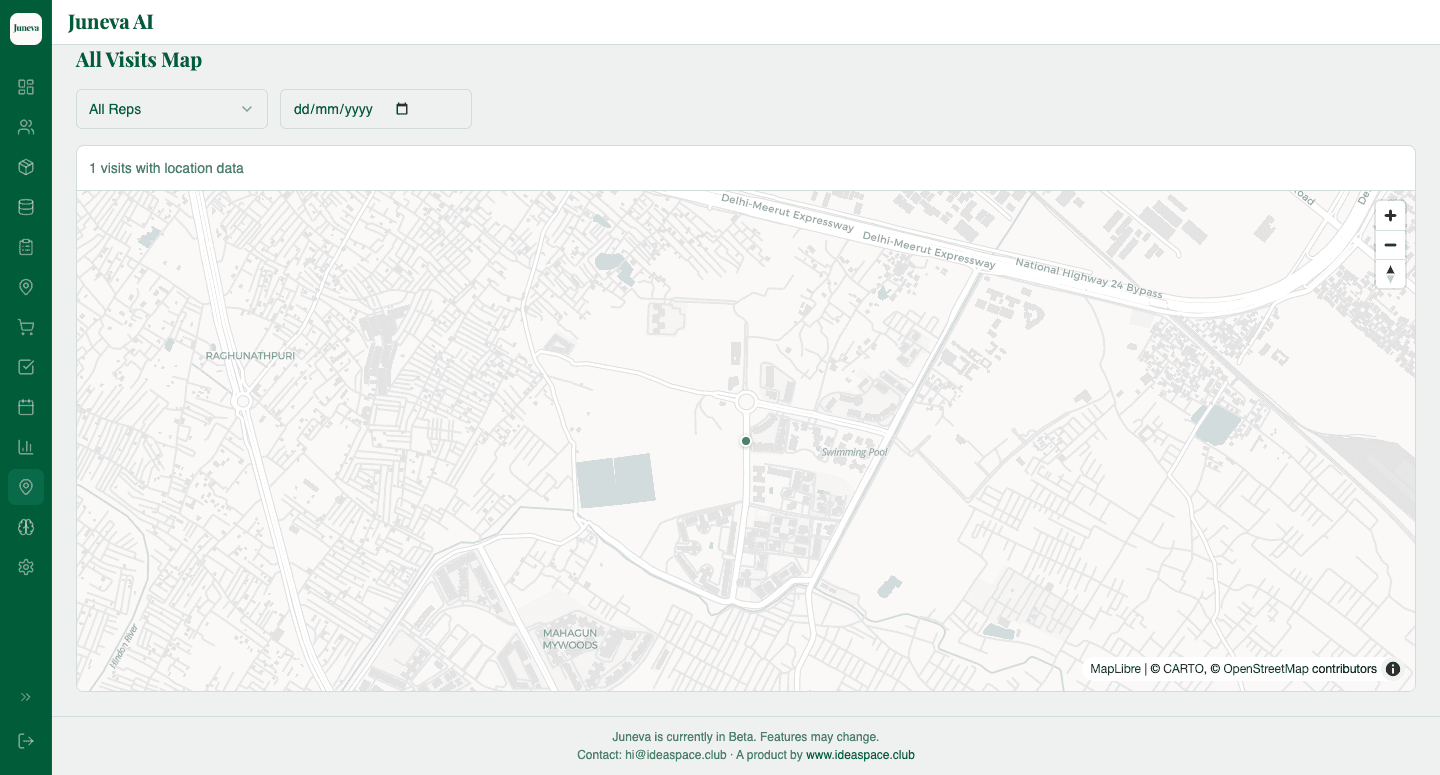 7. AI Intelligence Layer (Rolling Out) Juneva is evolving from a tracking tool into a field intelligence platform. The AI layer focuses on smart visit planning, performance pattern detection, rep productivity insights, auto-generated summaries, and anomaly detection — transforming raw field data into managerial intelligence.