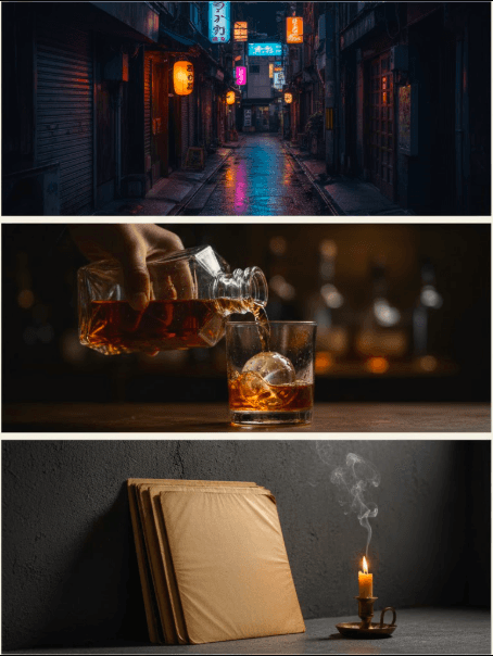 A full-bleed mood board — charcoal, amber, navy tones. Japanese bar aesthetics, vinyl sleeves, candlelight. Set the atmosphere before showing any product.